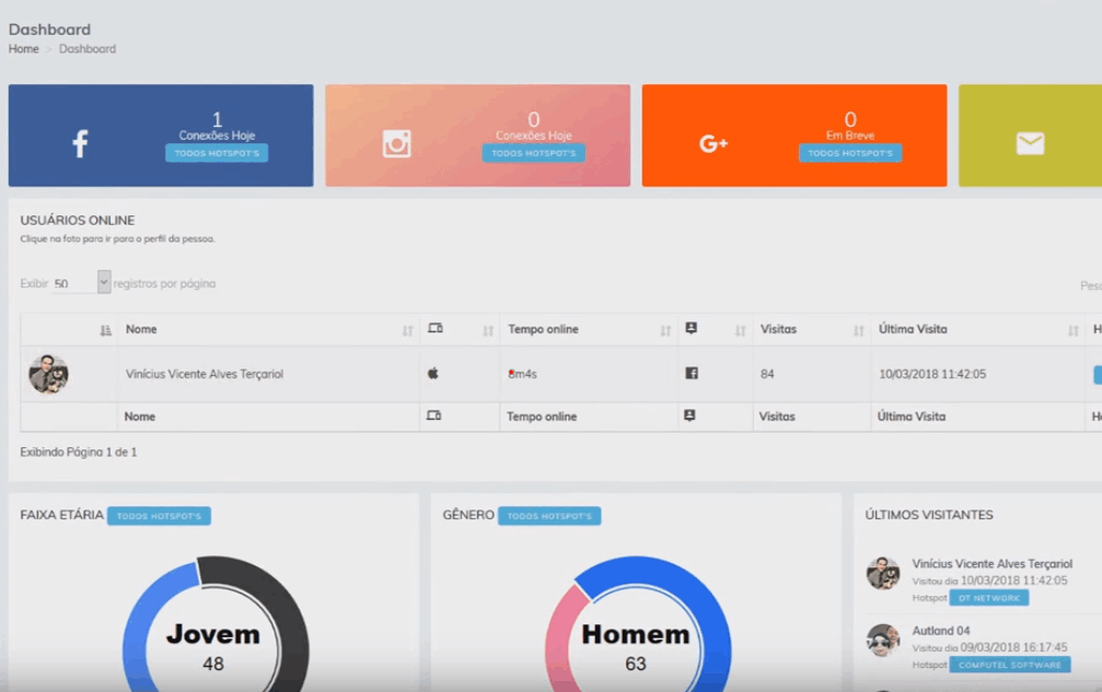 Permita que os visitantes usem Wi-Fi gratuito, entrando via Facebook, Google, Twitter, Linkedin, Instagram e muito mais. Capture dados sociais valiosos, cresça suas listas de e-mail marketing e oportunidades de oferta de patrocínio.